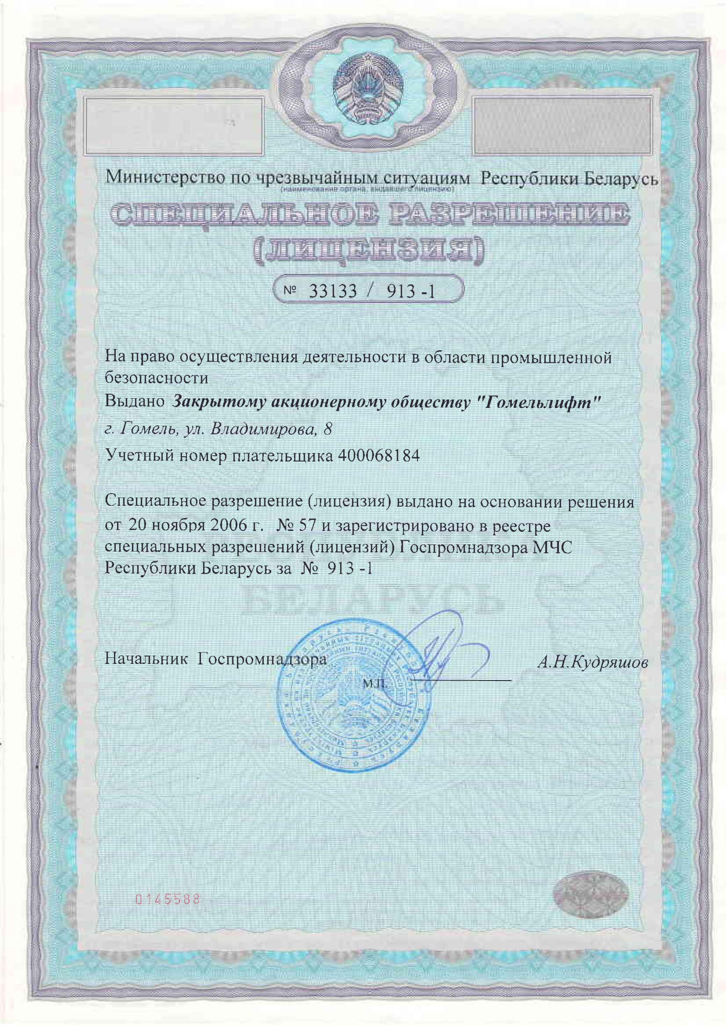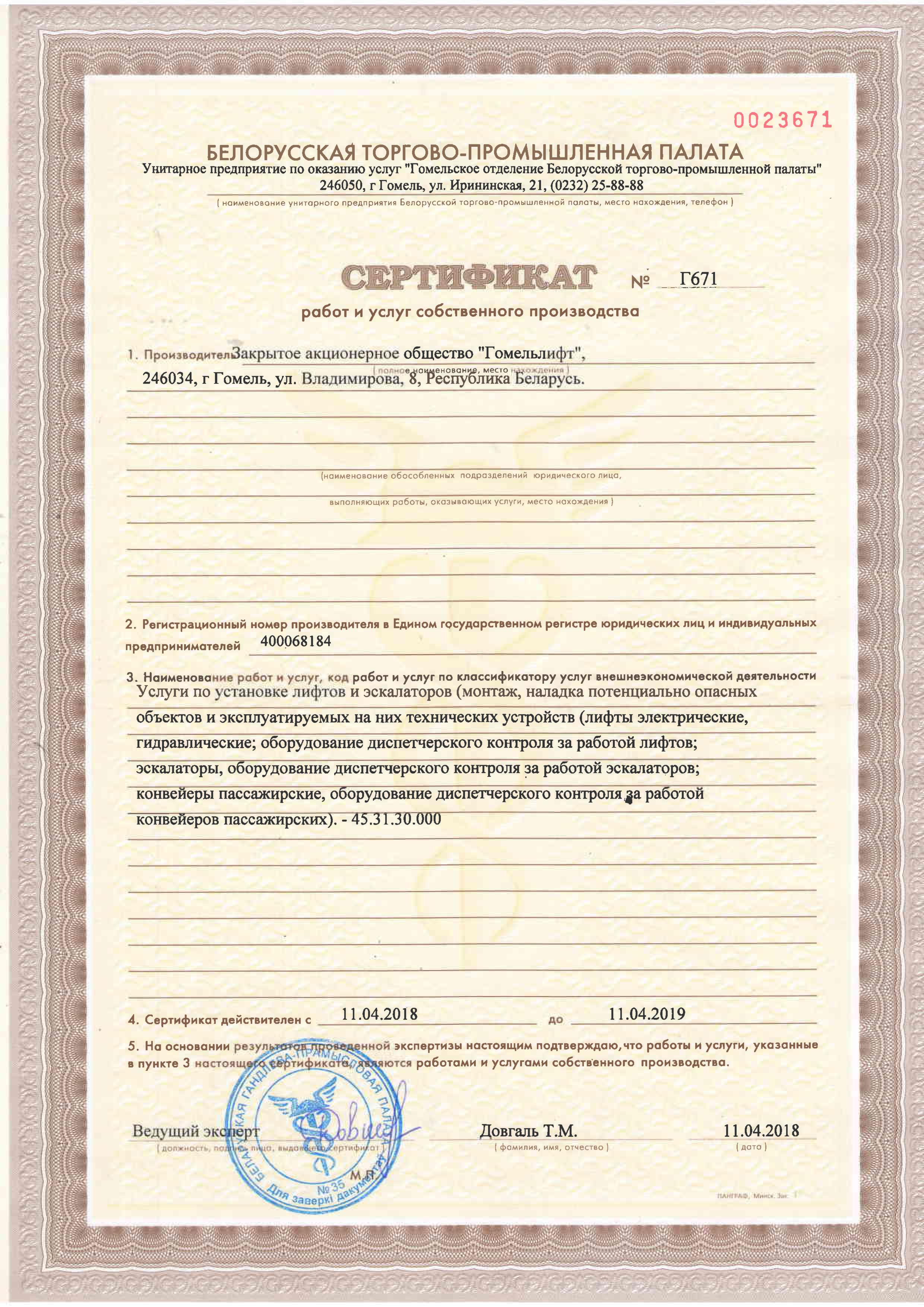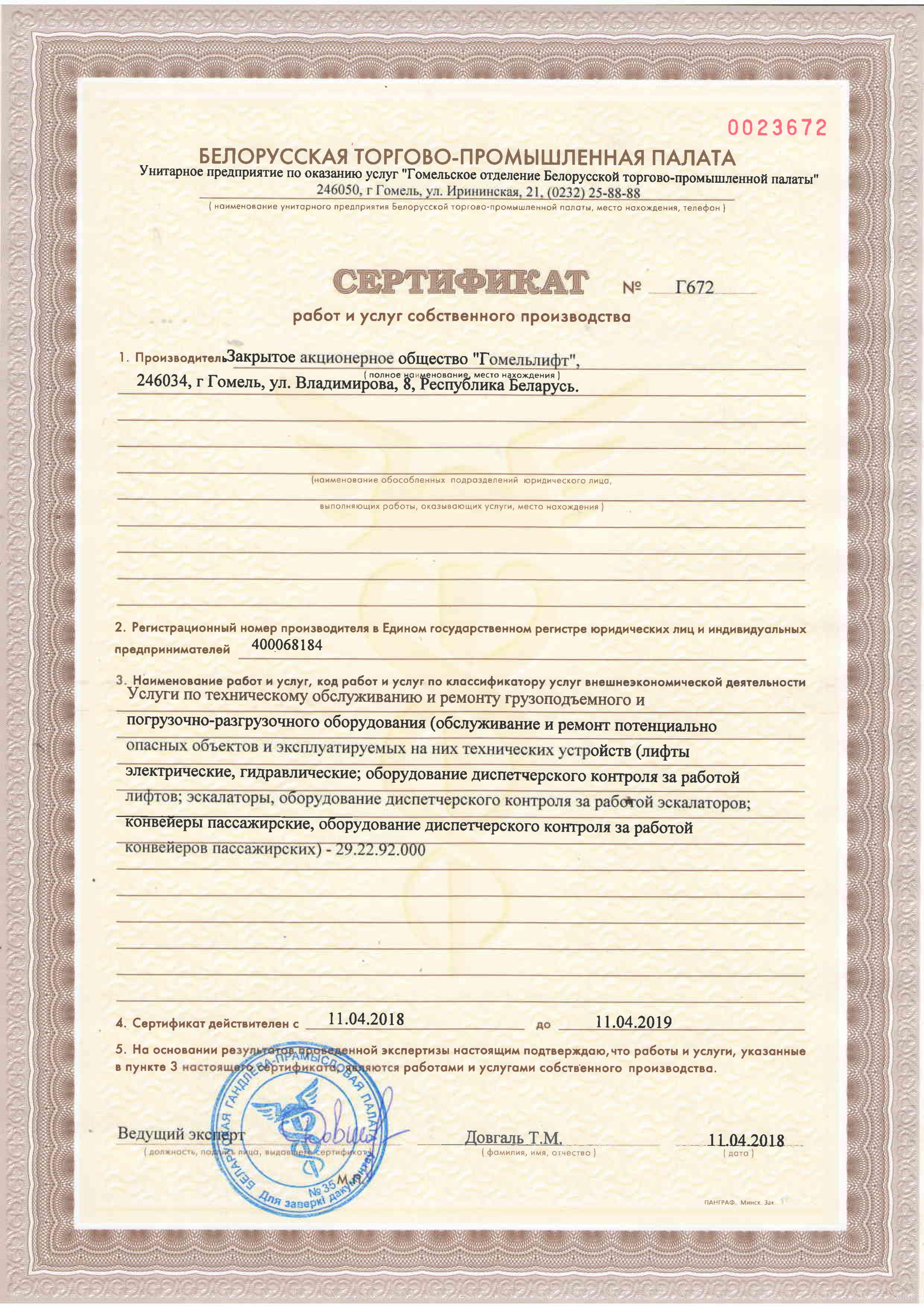 Сертификат услуг БелТПП по техническому обслуживанию и ремонту грузоподъемного оборудования