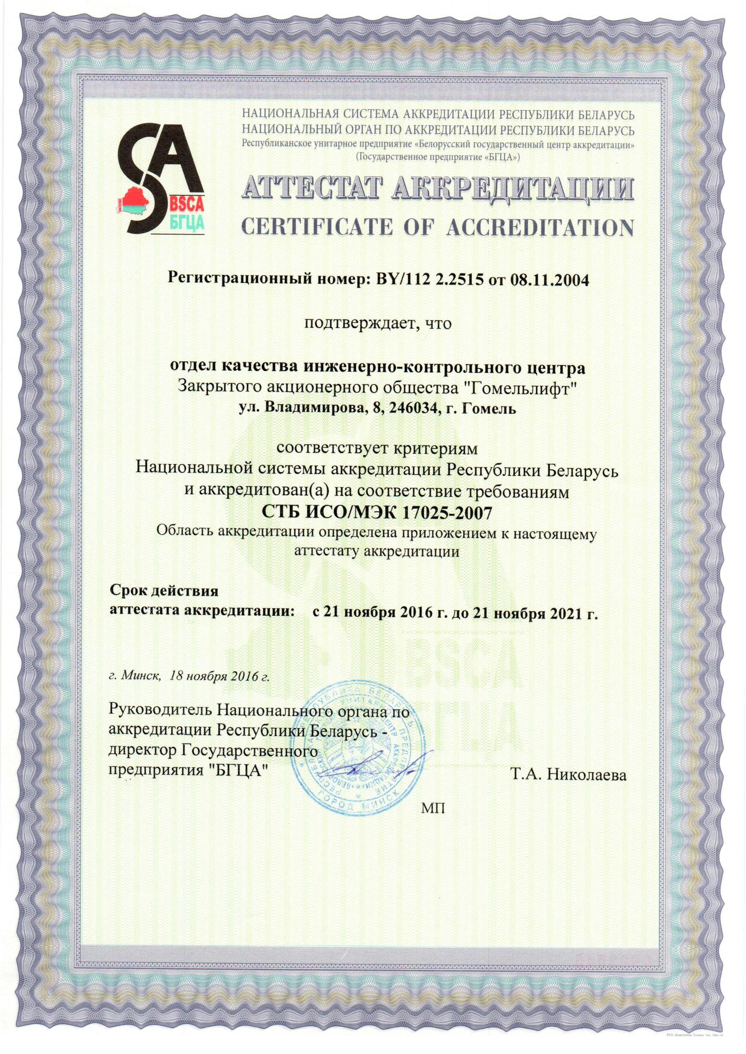 Аттестат аккредитации отдела качества инженерно-контрольного центра